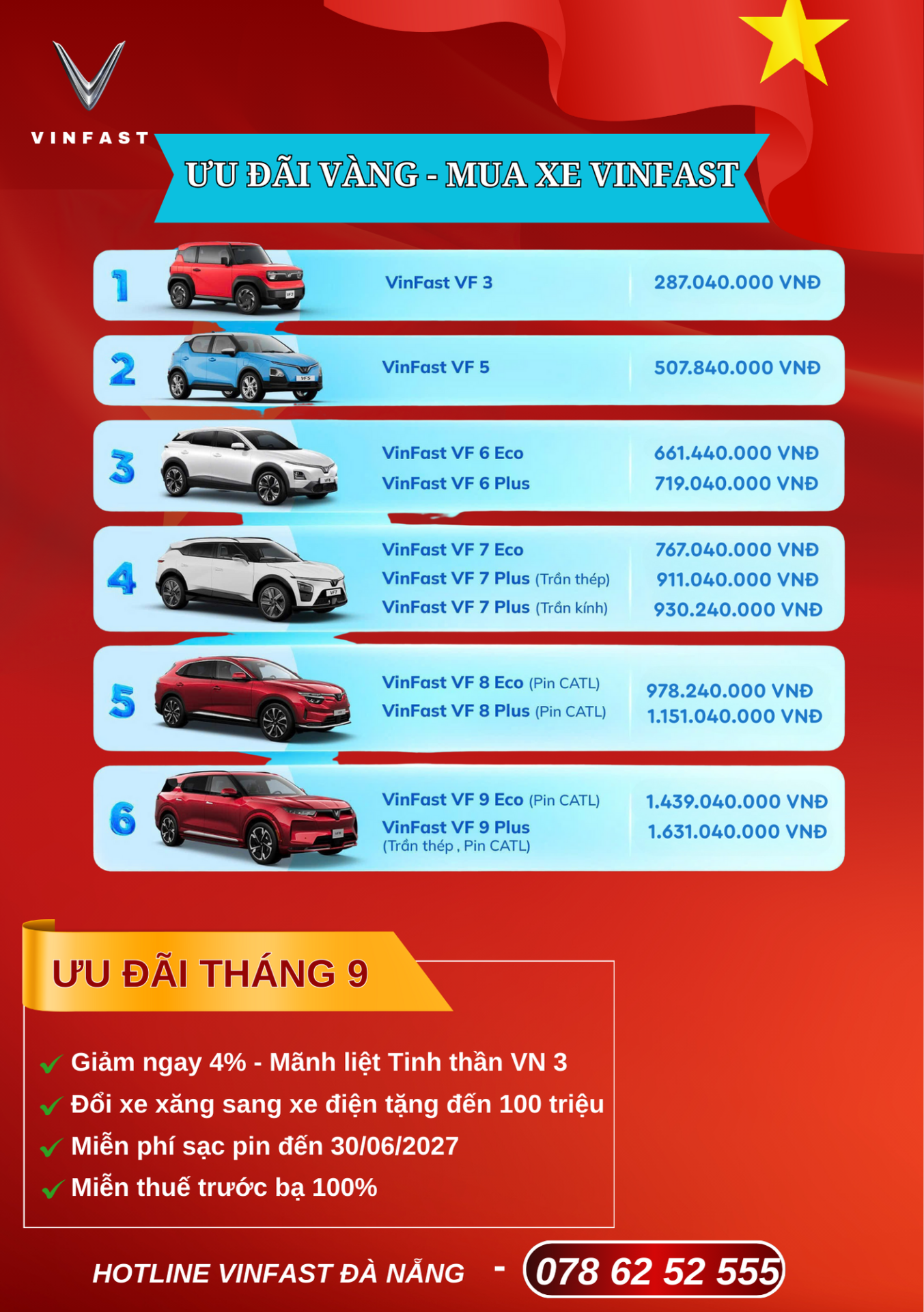 GIÁ BÁN VF 3, VF 5, VF 6 , VF 7, VF 8 , VF 9 TẠI ĐÀ NẴNG CẬP NHẬT TRONG THÁNG 9/2025